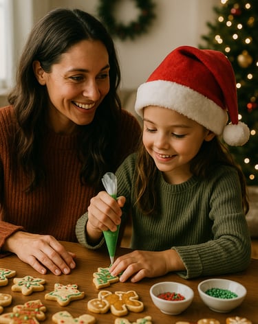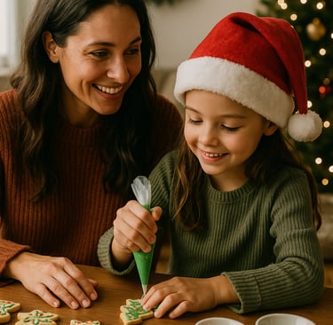 You and your child sit at the table with glitter, ribbon, and pinecones. Holiday music plays softly in the background. As you glue and tie, your child asks, “Did you make these when you were little?” You smile and share a story about your own childhood holidays.