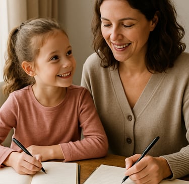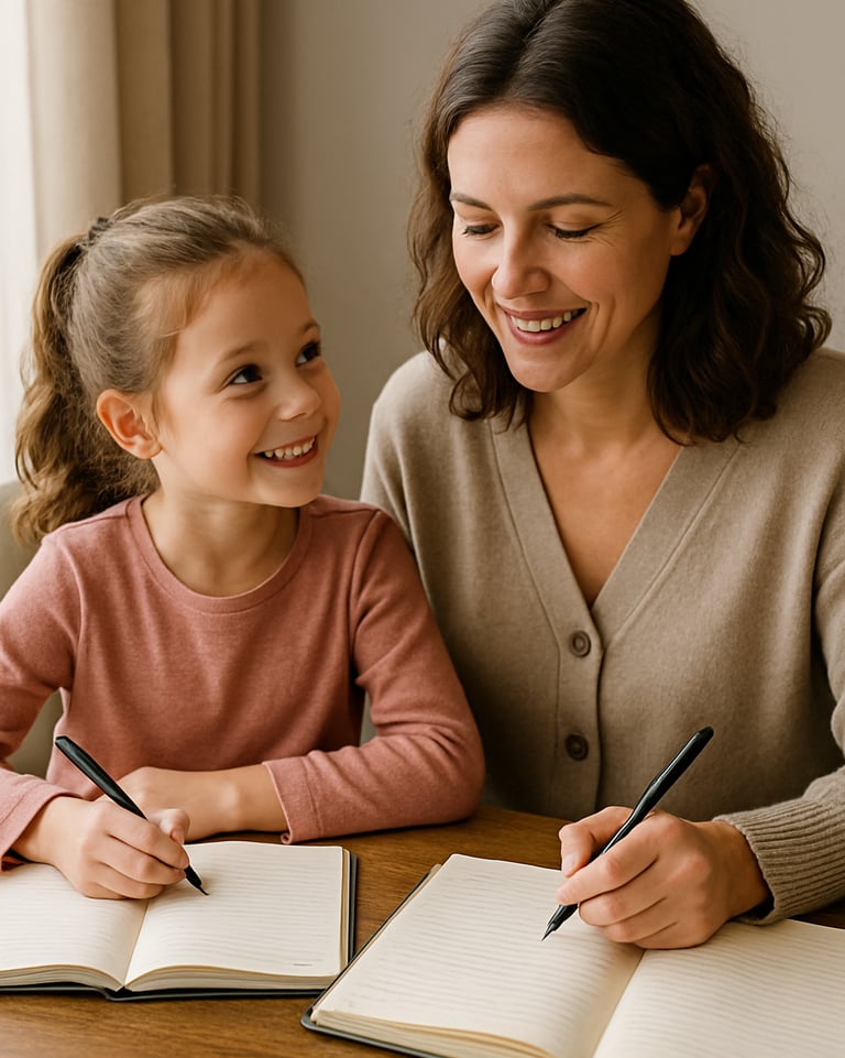You sit at the table with a notebook between you. The room is quiet, except for the soft scratch of pens. After a while, your child turns their page toward you with a shy smile. “I wrote about how fun our weekend hike was,” they say.